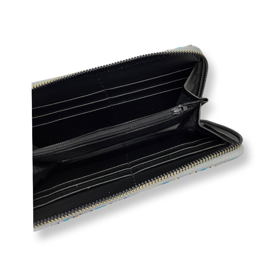 Portafoglio grande in ecopelle con stampa in tessuto con disegni di occhi turchi. Chiusura con cerniera. Interno con 12 (6+6) scomparti per carte, Scomparto interno diviso in due, con tasca centrale con chiusura a cerniera per riporre monete.