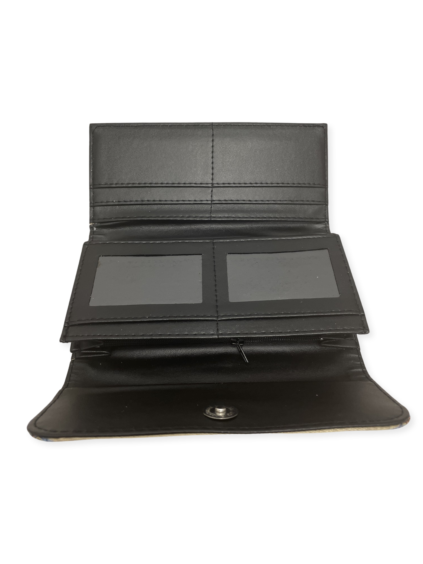 Portafoglio grande in pelle sintetica con stampa in tessuto che imita i tappeti turchi. Chiusura con patta con magnete. Interno con 4 slot per carte, 2 slot trasparenti per documentazione o foto e un ampio scomparto per riporre le banconote. Interno dello scomparto diviso in due, con tasca centrale con chiusura a cerniera per riporre le monete.
